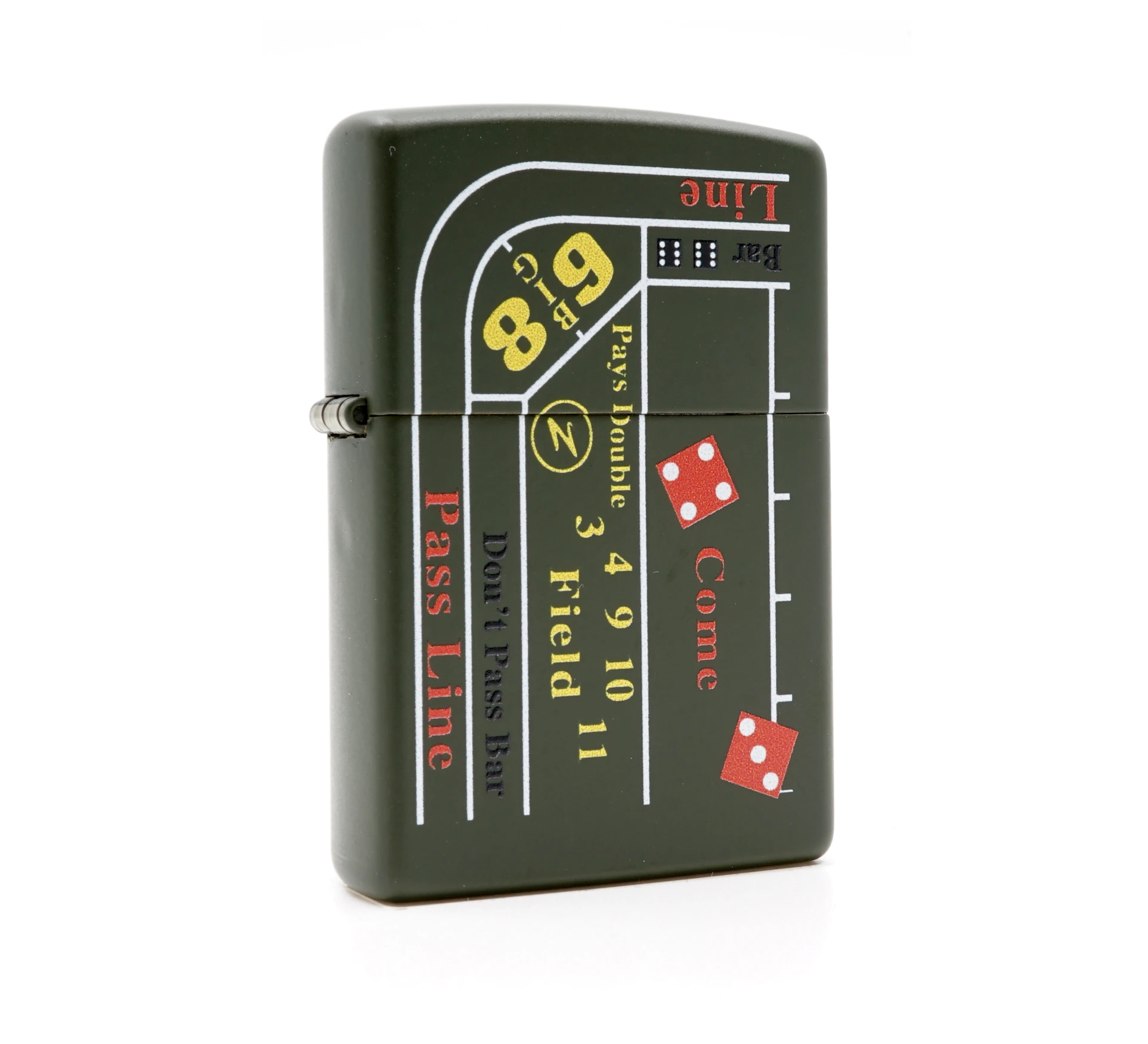 Motief | Een casino tafel in de kleuren geel, rood en zwart, geprint op een donker groene Zippo aansteker. |