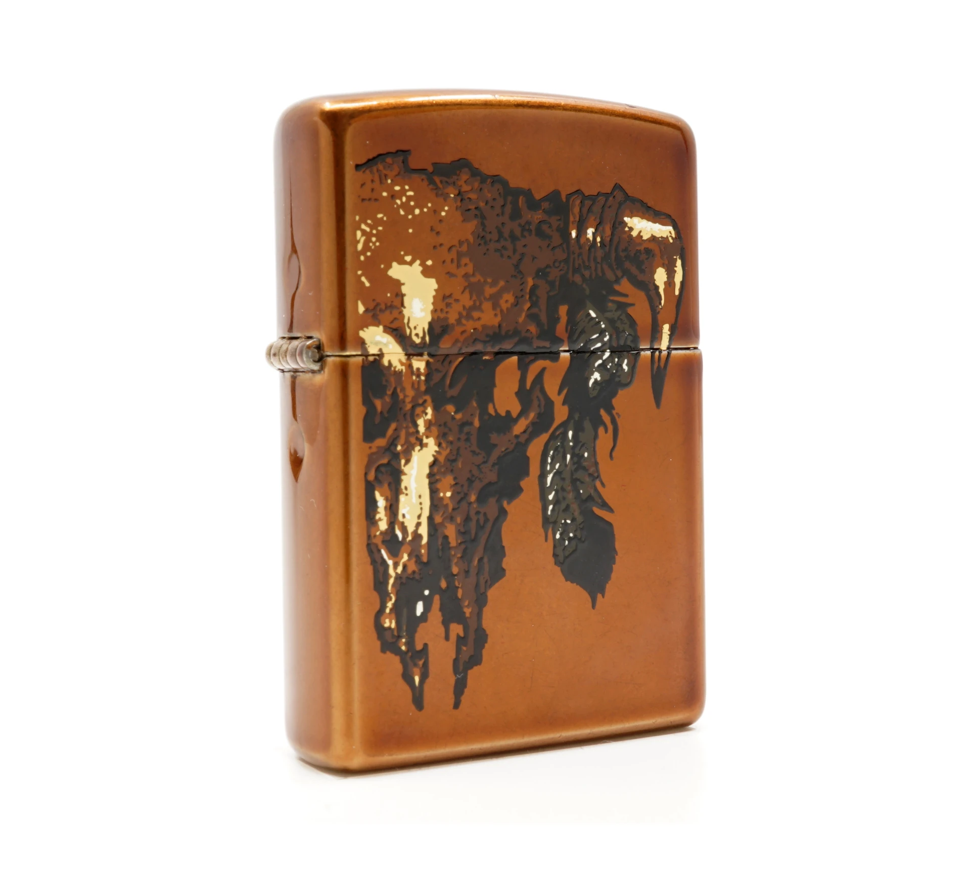 | Motief | Een Zippo aansteker in de minder bekende Toffee kleur met daarop een indiaanse doodskop geprint. |