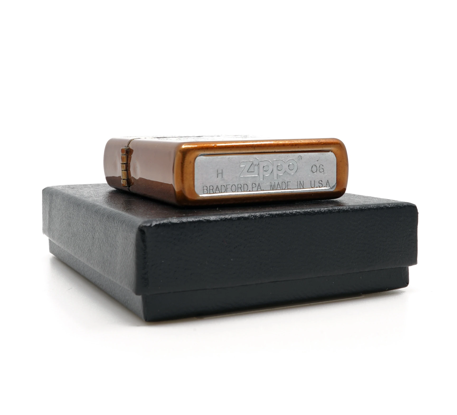 Deze Zippo Desert find valt meteen op door zijn unieke toffee kleur. De kleur heeft een warme bruine tint die net iets zachter oogt dan standaard bruin. De afwerking is Color Iced met een subtiele Street Chrome look, waardoor de Zippo mat en licht glanzend tegelijk aanvoelt. Op de voorzijde vind je een opvallende print van een indiaanse doodskop, die met zorg is aangebracht en diepte geeft zonder reliëf. Je voelt de soepele, stevige behuizing in je hand en ziet hoe het design kracht en mysterie uitstraalt. De print is donker, met nuances die lijken te spelen met licht en schaduw. Deze Zippo Regular combineert een avontuurlijk motief met een tijdloze afwerking. Een keuze als geen ander, speciaal voor wie zoekt naar karakter en stijl in één aansteker. Als "Retired of 2006" is dit model niet meer in productie, wat het extra bijzonder maakt voor verzamelaars die op zoek zijn naar karakter en stijl in één aansteker.
