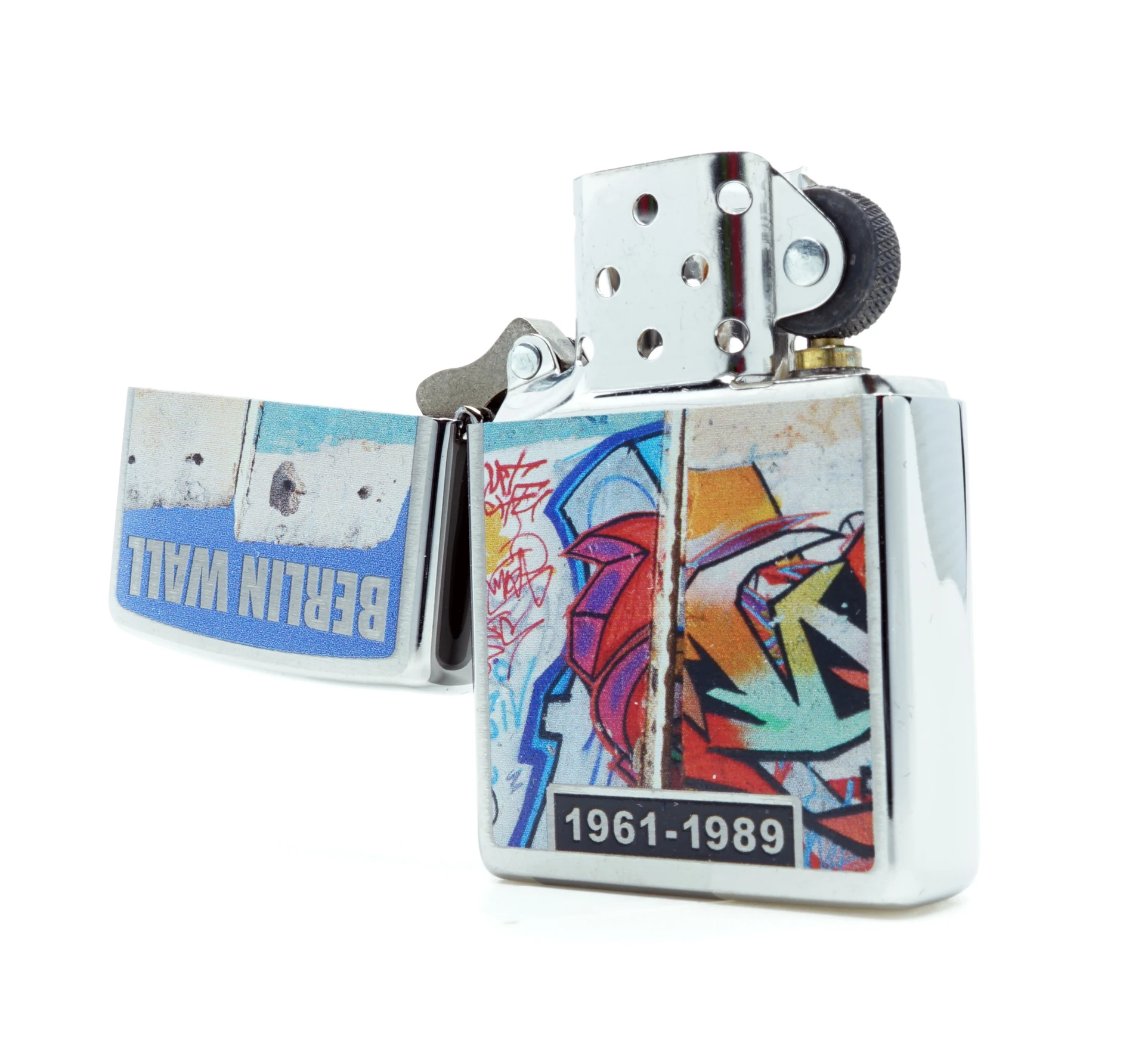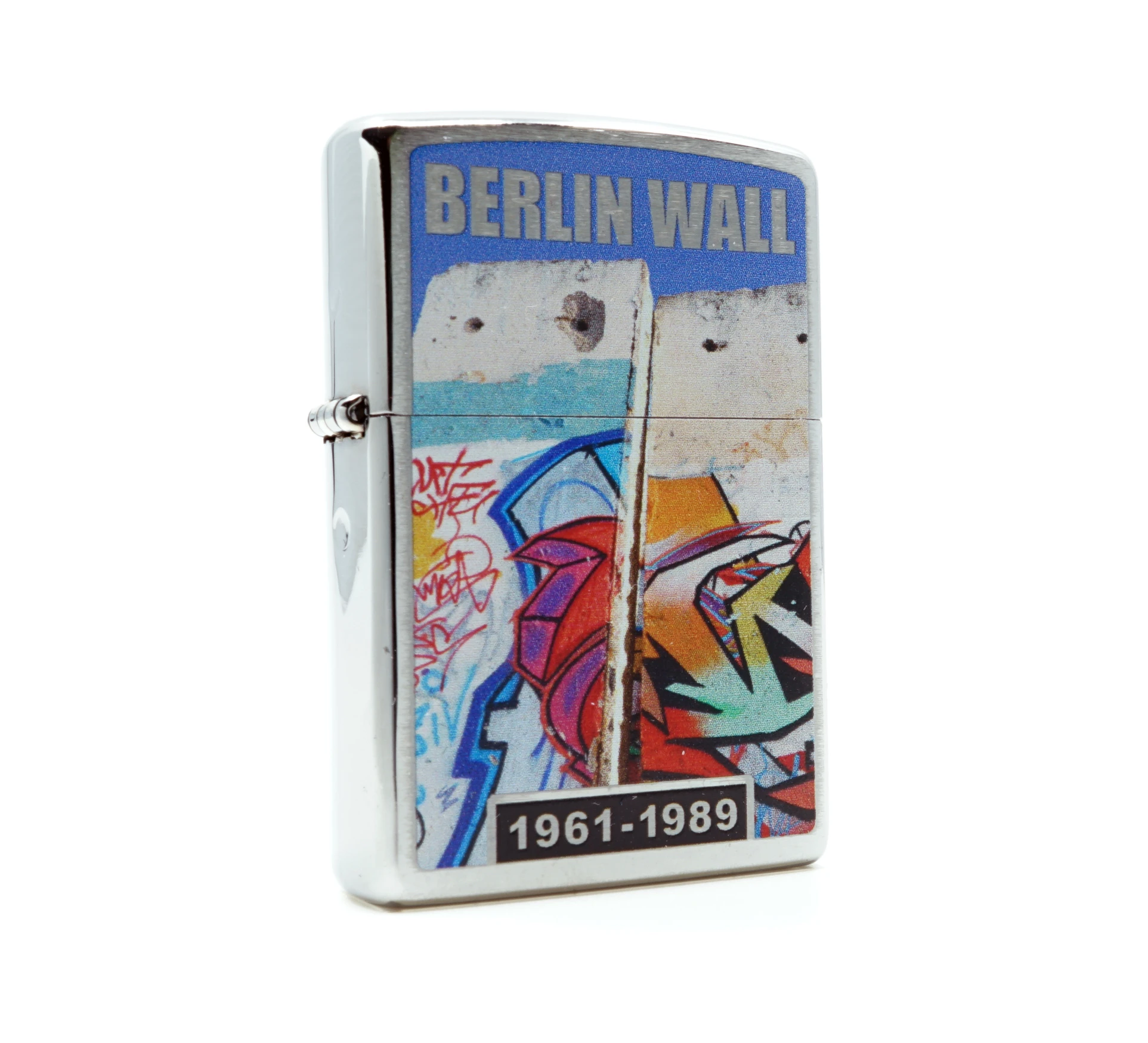 | Motief | Een prachtige print van de Berlijnse muur volgespoten met graffiti en op de onderkant de tekst '1961-1989'. Dat alles op een geborstelde chromen Zippo aansteker. |