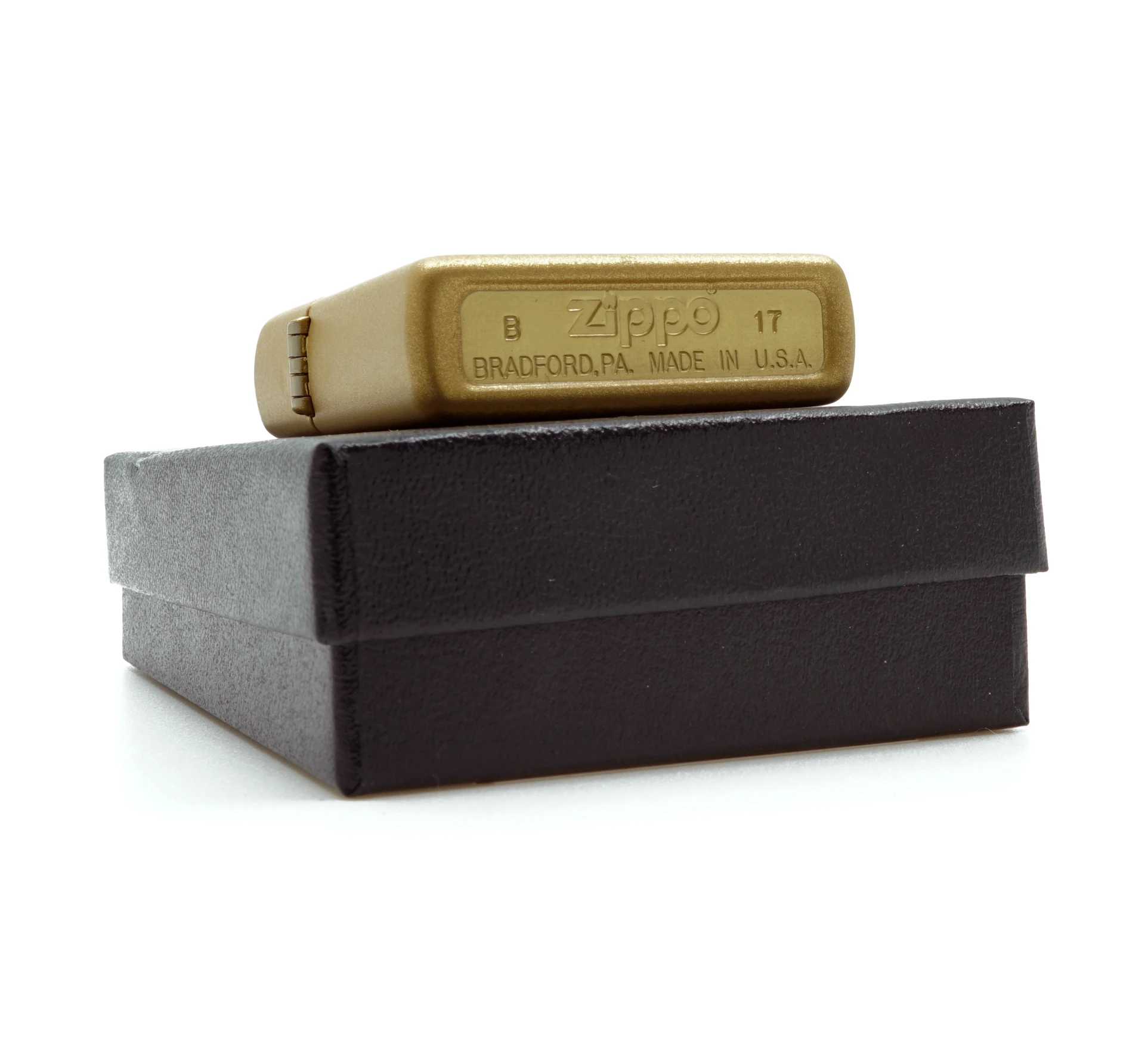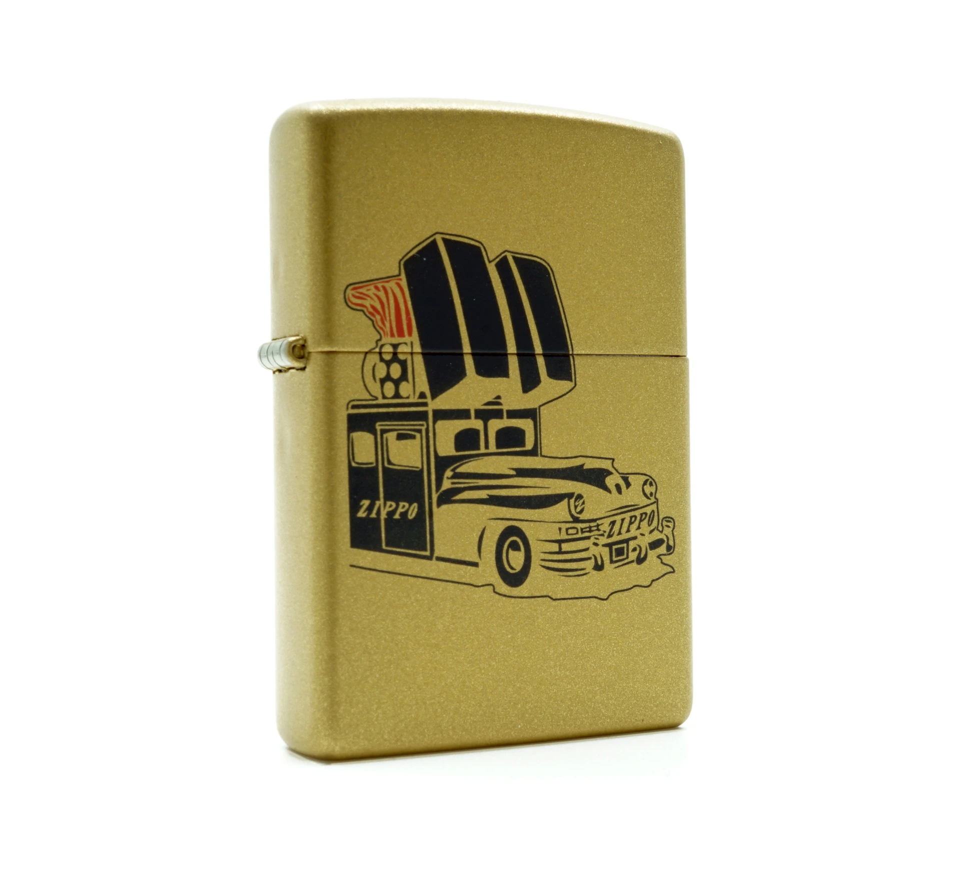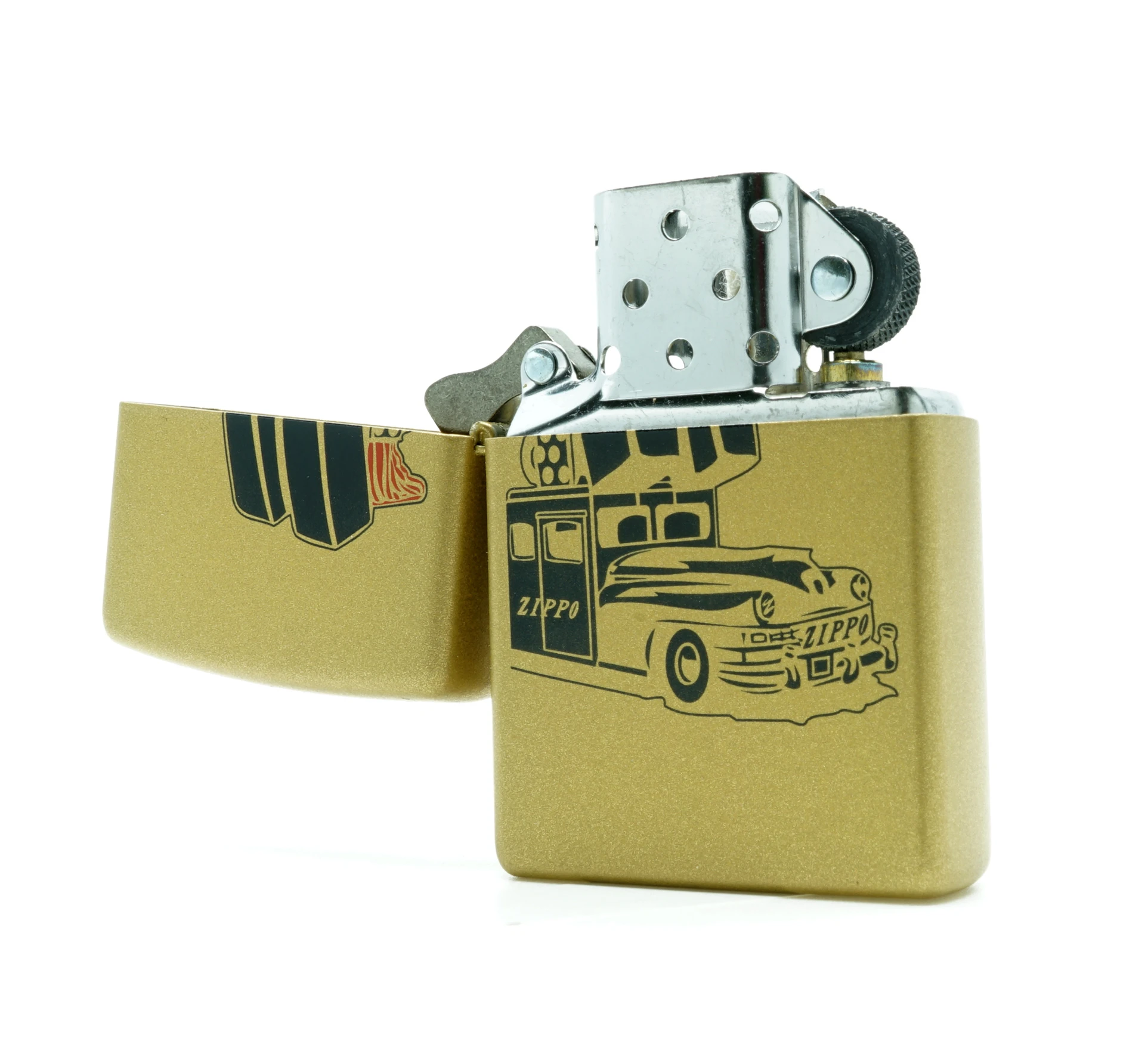 | Motief | De iconische Zippo auto geprint in het zwart op een matte goud-gele Zippo storm aansteker. |