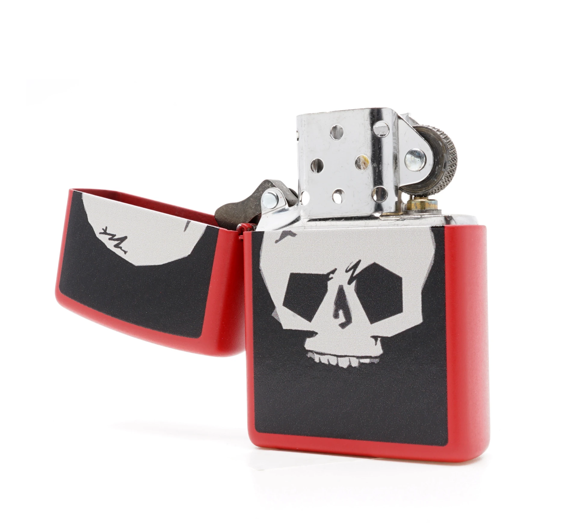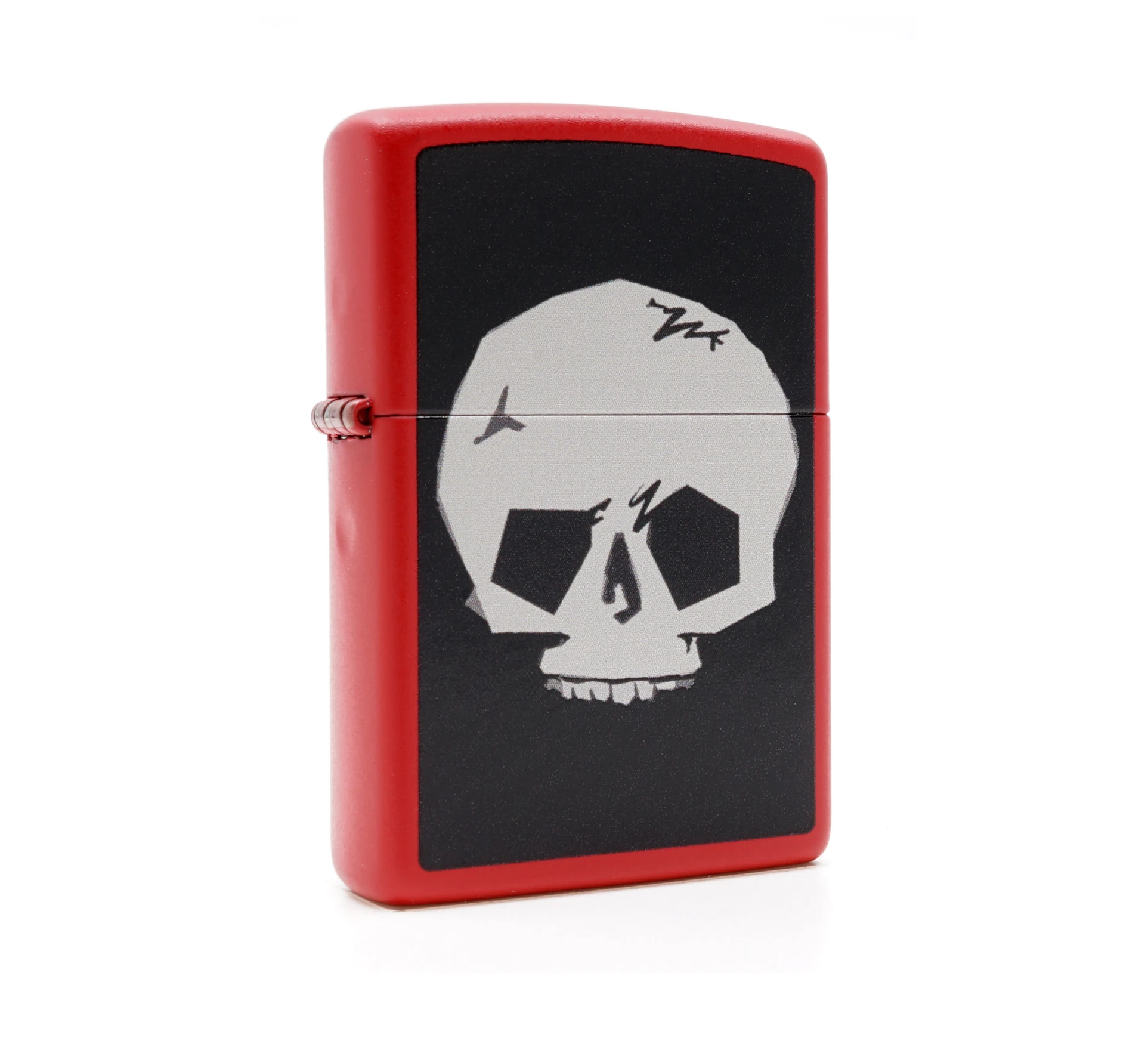 | Motief | Een 'Planeta' Zippo aansteker in een rode matte kleur. Op de voorkant staan een zwarte achtergrond met daarop een wit gekleurde schedel. |
