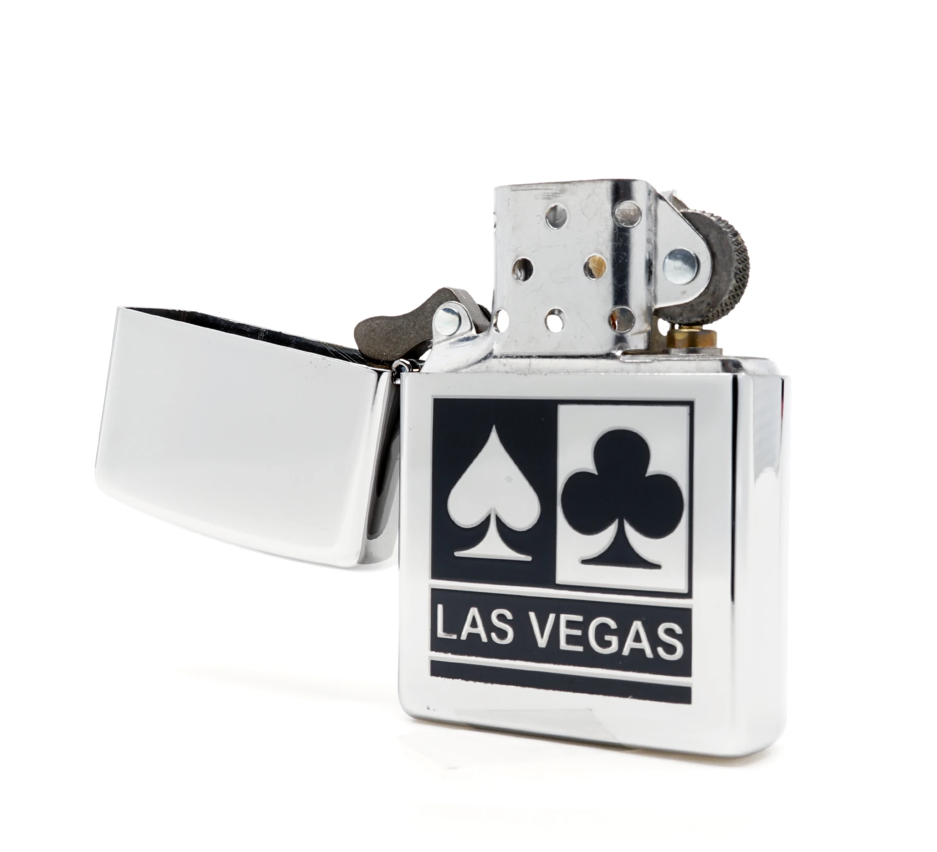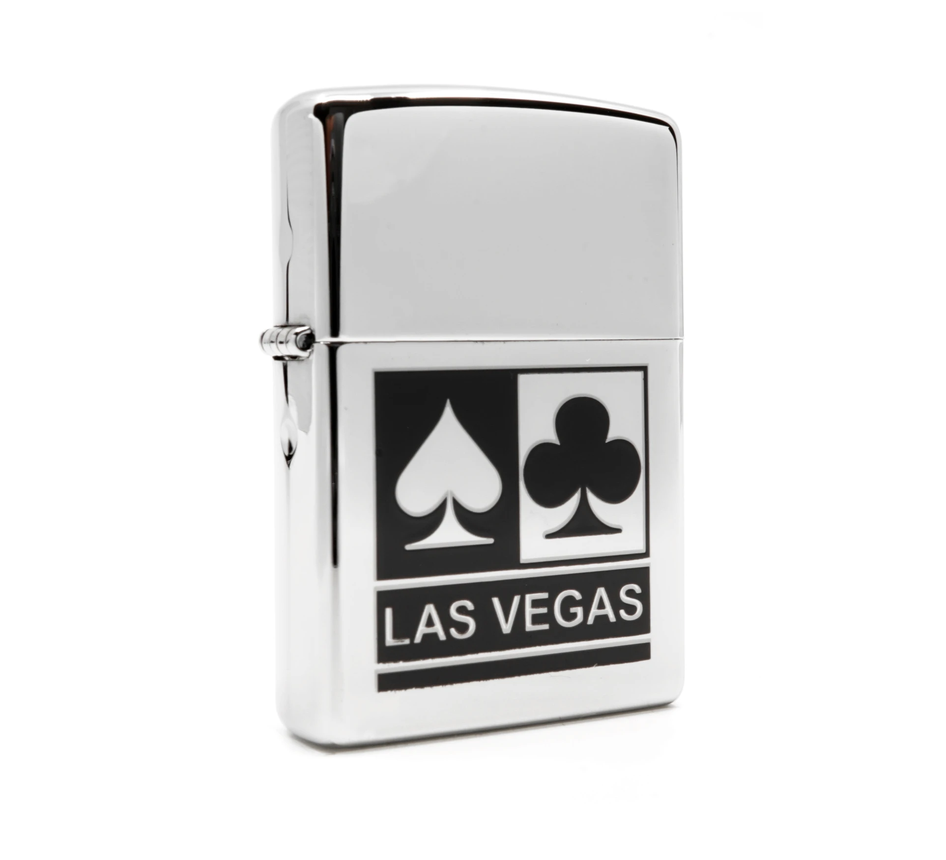 | Motief | Een gepolijste chrome Zippo met daarop een aas en een klaver geprint in het zwart-wit en de tekst 'Las Vegas'. |