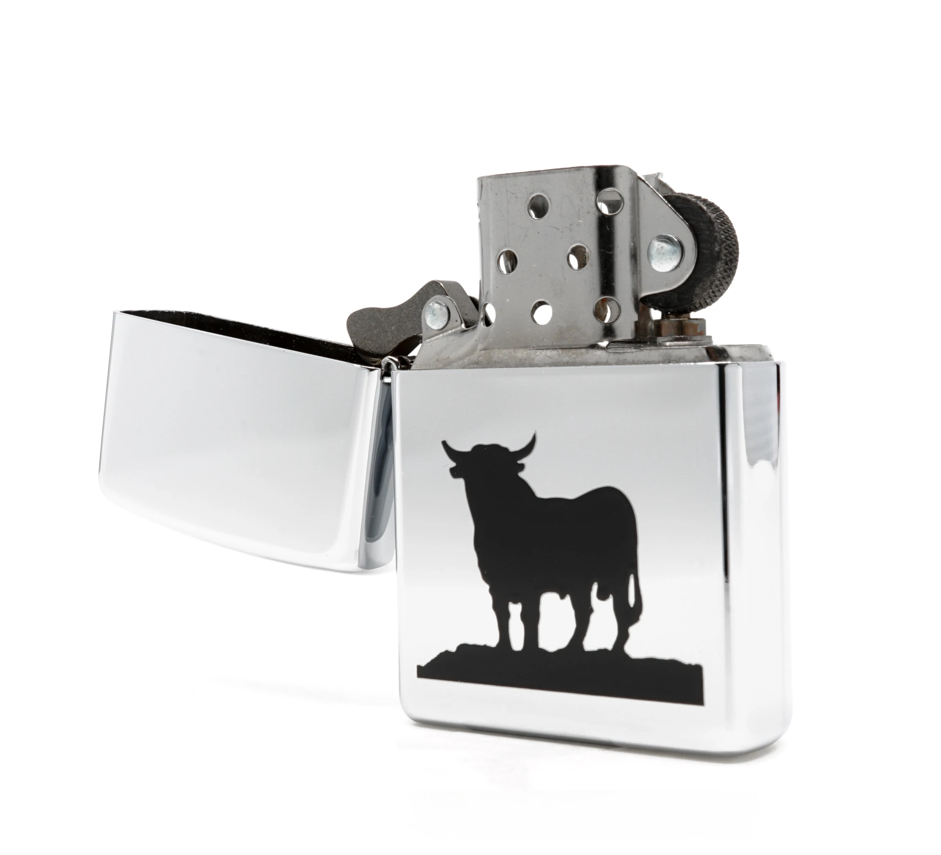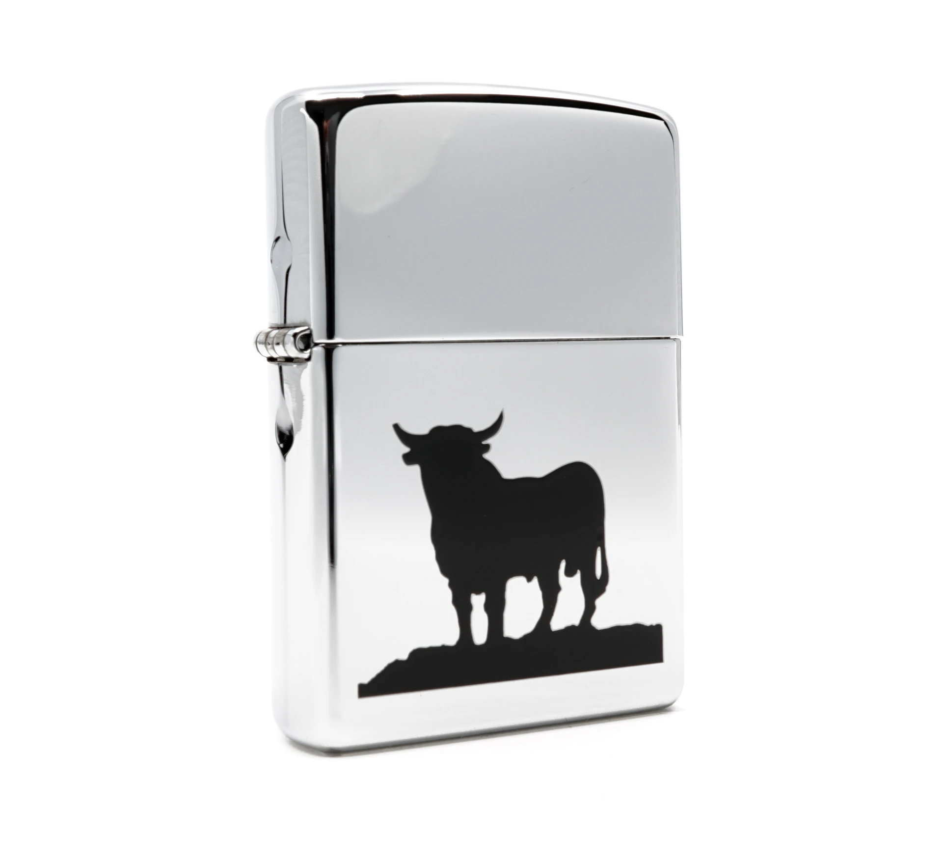 | Motief | Een Spaanse stier in het zwart geprint op een volledig chromen en gepolijste Zippo gemaakt in 2003. |