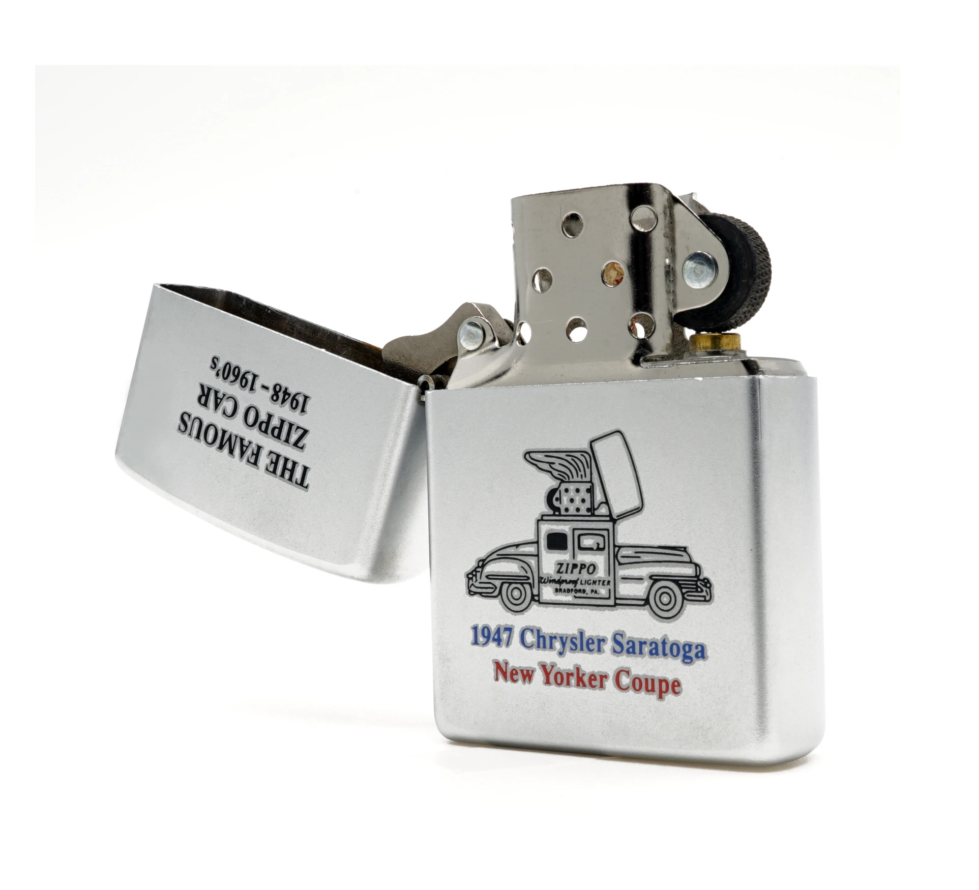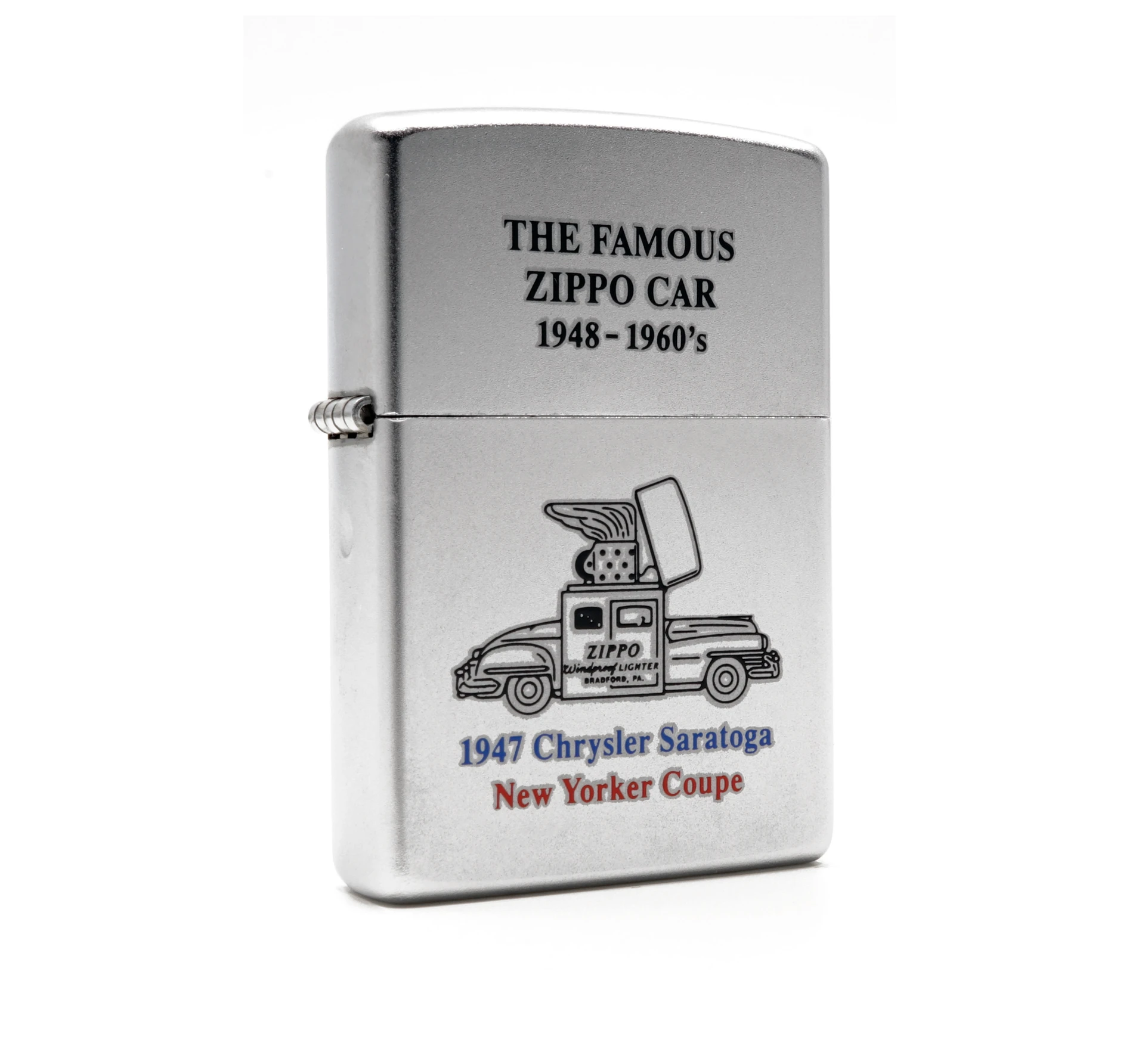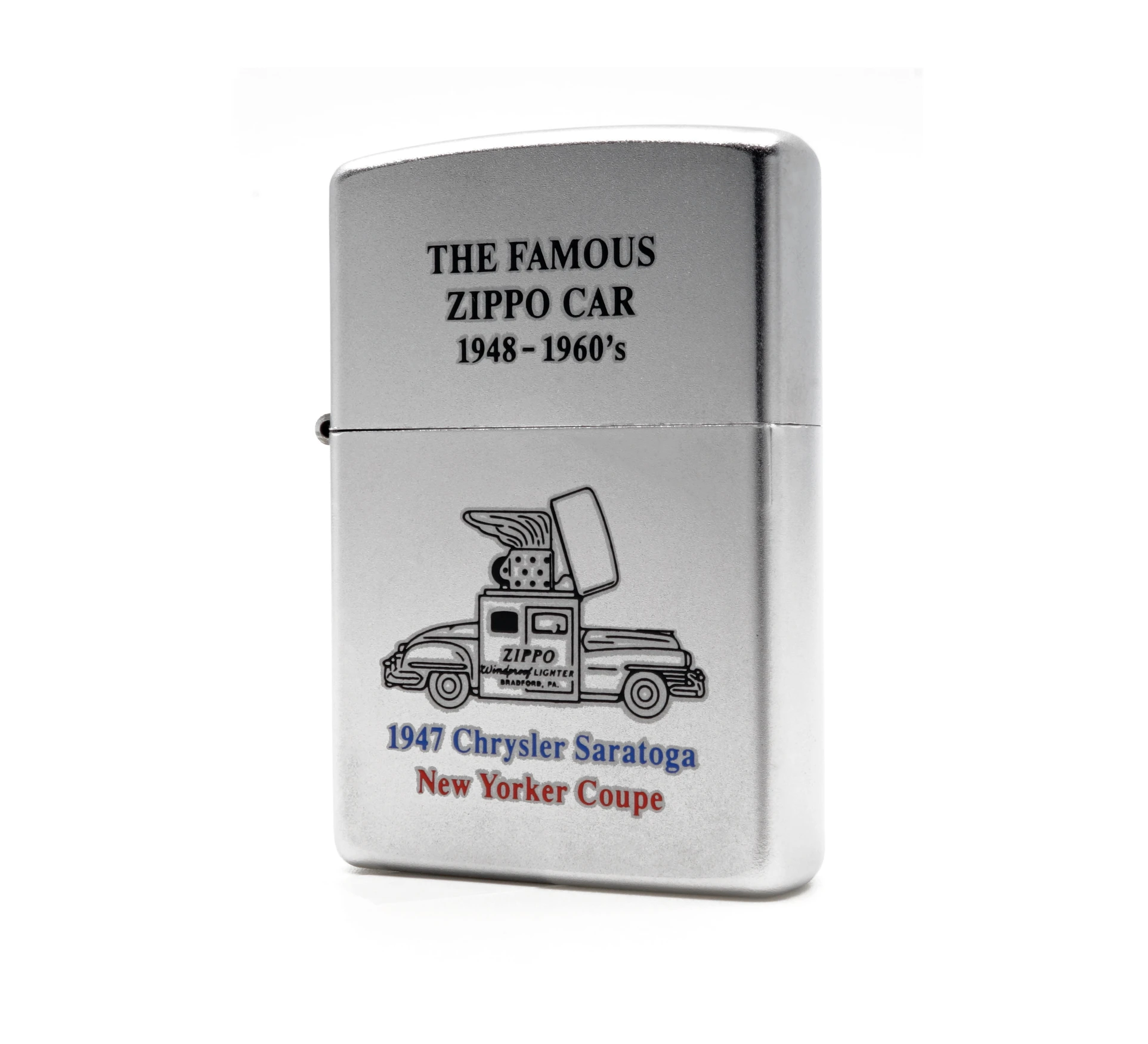 | Motief | De iconische Zippo auto geprint op een satin chrome Zippo. Bovenaan staat de tekst 'The famous Zippo car 1948-1960's' en onderaan staat 'Chrysler Saratoga New Yorker Coupe' in een blauwe en rode kleur. |